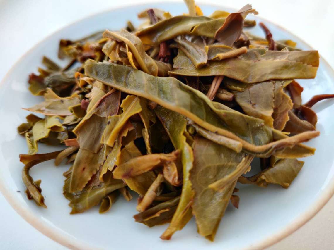 The tea soup has a dark yellow oily look, and the thickness is similar to a light oolong like Tieguanyin. The first 5 steeps very smooth, but we noticed a slight dryness in the after taste in the later steeps. Perhaps, dryness is drown out more while the steeping time is increased. We expect this to be reduced significantly in another 2 years of aging. We managed to get 9 very tasty steeps, which is a very decent yield for 4 grams of tea. Below a picture of the wet leaves.