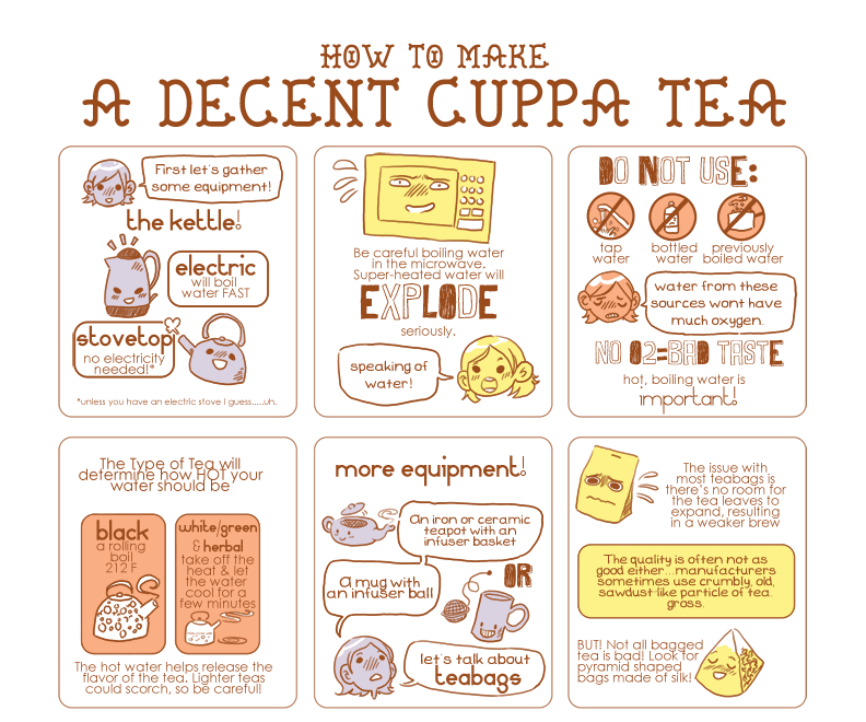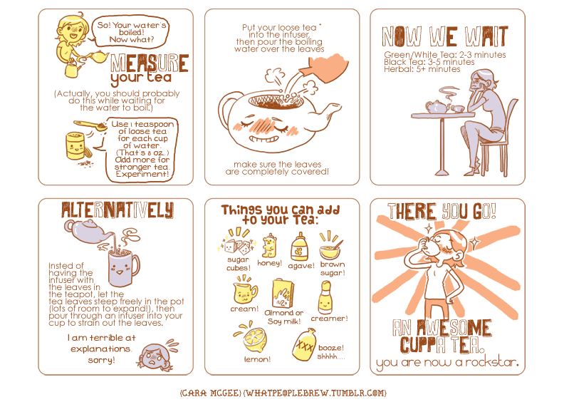 Below is a charming guide via whatpeoplebrew.tumblr.com, a blog in which the owner pairs different tea with different characters from pop culture. For example she pairs Bilbo Baggins from the Hobbit with Irish breakfast tea and Moriarty from Sherlock with Chai Tea. Fandoms aside, this fantastic guide is a wonderful source that goes through the numerous ways you can make a good “cuppa tea”: